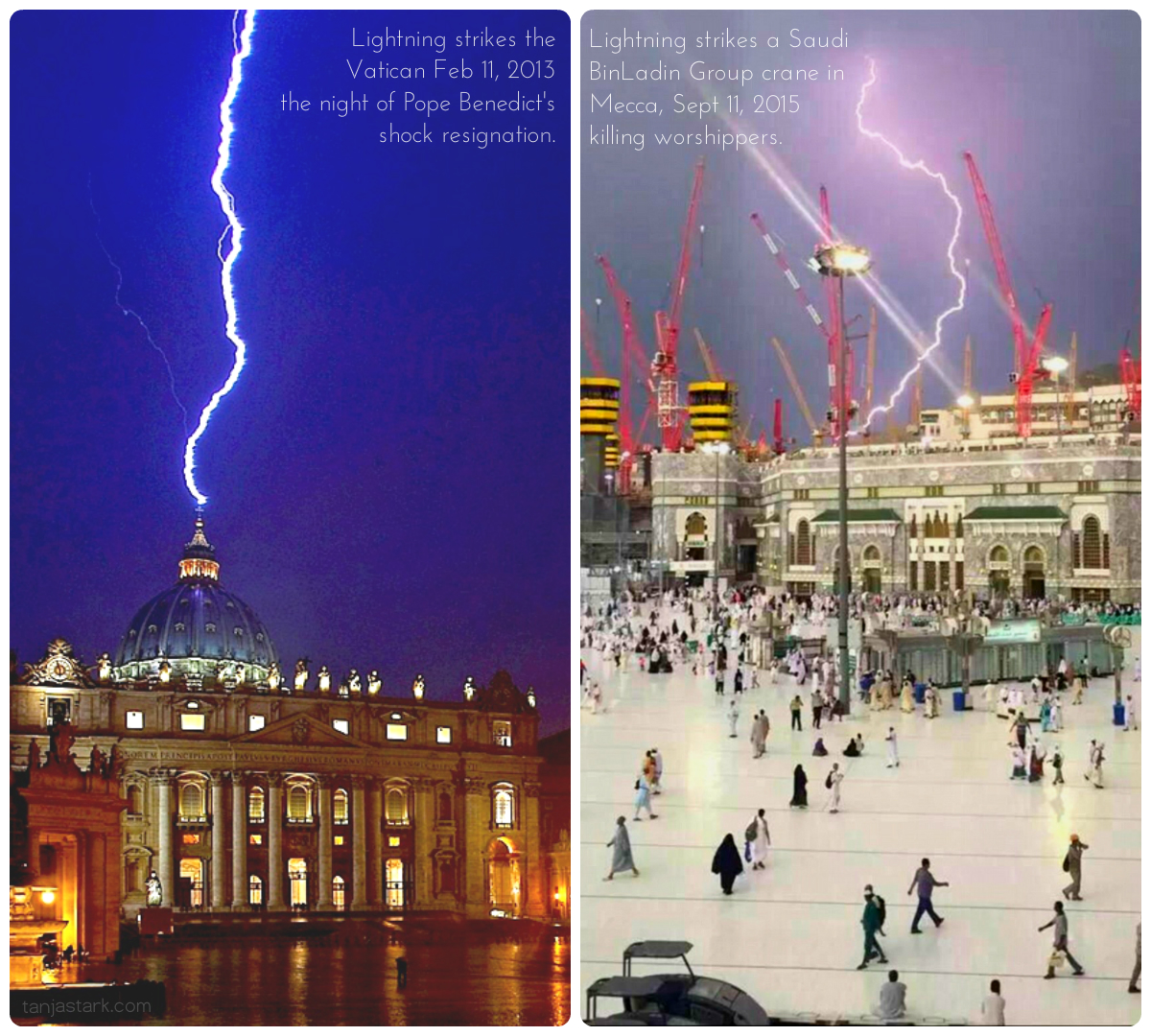 Lightning struck Mecca on September 11, 2015 toppling a crane owned by the Saudi BinLaden Group, killing worshippers.
